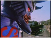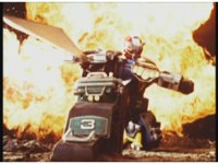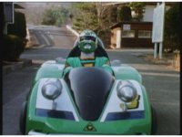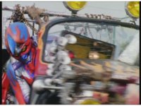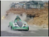 Demon Racer & Green Ranger remain neck and neck, as they quickly approach some blockade walls in the middle of the road (with Japanese writing on them, shh!). Green buckles down and speeds ahead of the monster, prompting him to fire horn blasts again, dust bursting but missing him. |