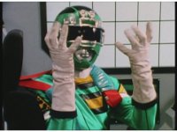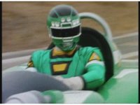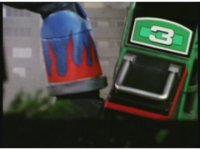 Green responds with his hands like a mad scientist just putting on rubber gloves, then grabs controls, shifts gear, causing Turbo Megazord to stomp its Green leg down on Demon Racer II's foot, causing the monster much agony. |