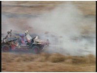 Green swiftly swerves between the blockade walls, but Demon Racer fails to see them through the passing dust in time, and quickly tries to swerve to a stop, but slams into one of them and his car explodes. |