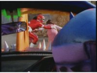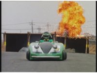 Green continues racing at Demon Racer II, who raises his foot and begins to stomp down on the Ranger, when Green hits a button and fires a missile. His Turbo Cart darts beneath Demon Racer II's foot, narrowly avoiding being crushed. Distracted by this, he doesn't see the missile crashing into him, spark bursting him until he falls over. |