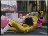 Pink & Yellow Rangers also slide down, catching a pair of civilians before they hit the pavement (right next to a Japanese sign, shh). |