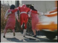 Demon Racer II drives at a pair of cowering females, but luckily Red Ranger rushes in and leads them to safety a foot away, narrowly avoiding the passing car. |