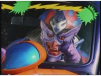 Demon Racer II talks and points down. Green talks and points up, then jumps into his Turbo Cart and speeds away just as the monster tries and fails to grab him with both giant hands. |