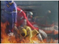 Through the flames, the four Rangers get up, watching their teammate's appearance. |
