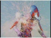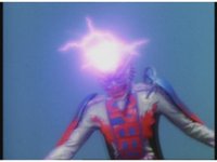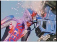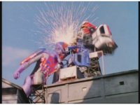 Demon Racer II leaps forth, headbutting his horn repeatedly into Turbo Megazord, spark bursting it and its cockpit as it does several times. |