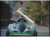 Green rides in his Turbo Cart down an empty road, raises a fist. |