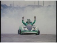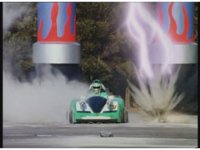 Green swerves around to a stop. Demon Racer staggers out of the smoking wreckage. Green talks at him, gesturing hands, then turns and poses, just as the monster collapses and explodes massively. |
