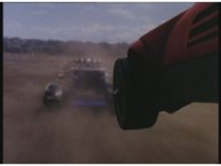 Green in his Turbo Cart races away from Demon Racer II, who fires horn beams down, dust bursting but missing the quick Ranger. |