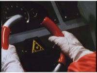 Red releases key, then grabs steering wheel, which shifts away its grey parts. |