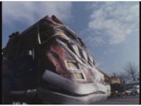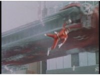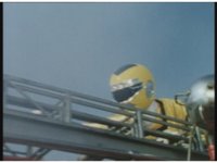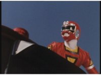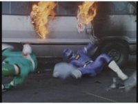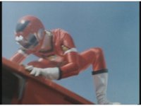 The last Ranger hanging on, Red is suddenly thrown off when Blazinator tilts and rolls against side of a building. |