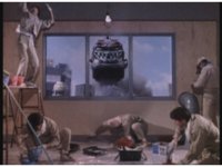 Cuts sequence of Pink & Yellow falling off into room onto painters. |