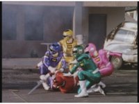 Side angle on the five Rangers, recovering, Red glancing back then holding blade forth. |