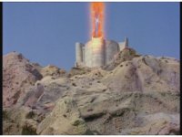Upward angle on the Command Center exterior, the mountain beneath it dominating the shot. A red beam fires skyward, two bluish energy figures sliding up said beam. |