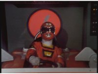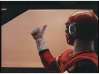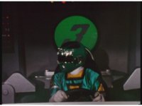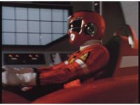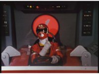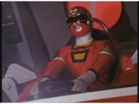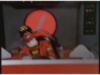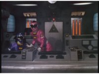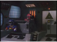 Track left in Megazord cockpit, Red seemingly saying something as he grips controls. |