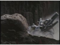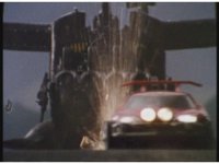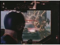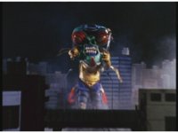 Zoom out as the Megazord head remains out and facing Elgar's vehicle. He glances over, zoom in as he reacts shocked. |