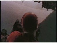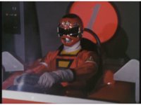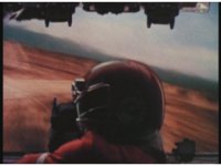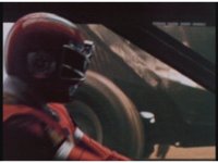 Red turns around in cockpit seat, while driving wildly all over the place. |