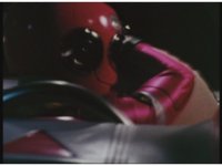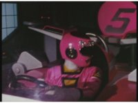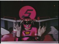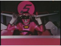 Pink reacts to the slowing Evil Vehicle in front of her by letting go of the wheel and acting like she's trying to get out of her Turbozord. |