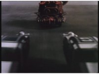 Evil vehicle with fanged loader in front comes up behind Red Lightning suddenly. |