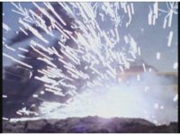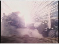 As Turbo Megazord remains with its back to the monster while partially in frame, Amphibitor violently spark bursts behind it. |