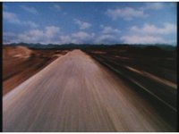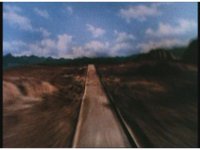 On one foot, leaning forth, Turbo Megazord speeds directly at us down a vast, endless dirt road. |