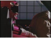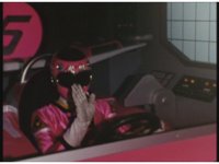 In her Turbozord, Pink holds her palm out in a cautioning gesture, then reaches over and presses a button. |