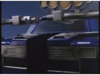 Zoom in on Blue as he gestures, then presses button, causing Mountain Blaster's front grill to rise while approaching the pair of connected Zords. |