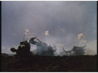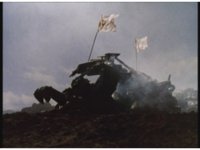 The five Evil Vehicles, all magically repaired, drive away waving white flags. |