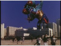 Giant Amphibitor marches through the city with a giant fork and knife, scaring the Asians. |