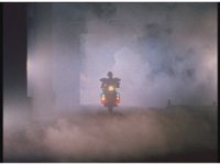 Blue Senturion pulls his Cycle to a stop and leans on his left leg, before stepping both feet off and slowly marching forth, remaining shrouded. |