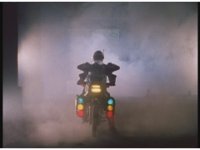 Blue Senturion drives into smokey warehouse on his Senturion Cycle. |