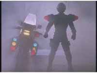 Slowly stepping out of the shadows, Blue Senturion stands before his Cycle, no longer shrouded. |