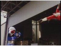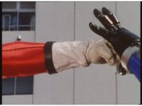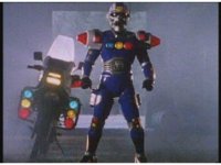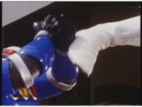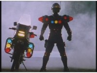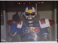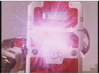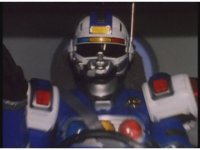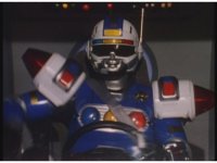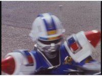 In Robo Racer cockpit, Blue Senturion motions and gestures left hand, zoom in as he reaches down and shifts gear, causing chest headlights to light up. Robo Racer pulls out a wrist blaster on its right arm, which it points forth and fires repeated bursts of energy. |