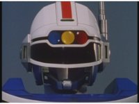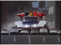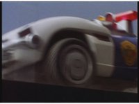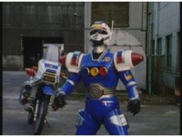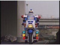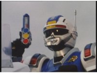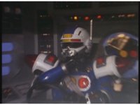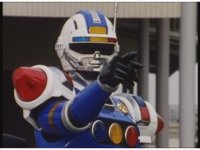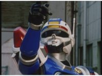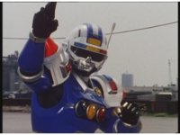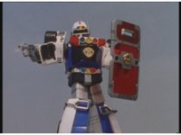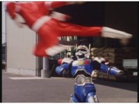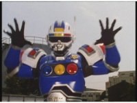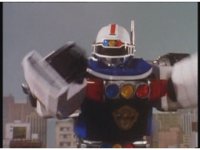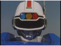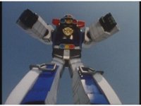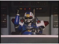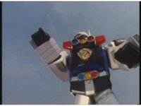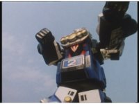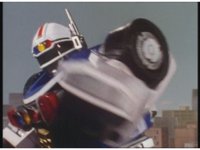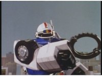 Inside the tunnel, Robo Racer continues driving. Blue Senturion talks and shifts gear, causing his Zord to shift around, transforming out of patrol car mode. Upon exiting the tunnel, Robo Racer lifts off the road, and finishes transforming into robotic Zord mode in a flash of blue energy, saluting before his giant badge symbol. |