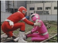 Pink shoves Red away, Blue Senturion fires yellow beam upon her, she falls, clutching her ankle. |