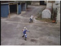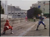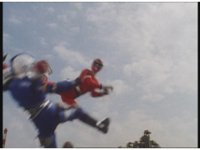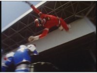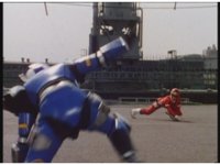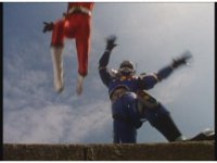 As Pink watches, Red and Blue Senturion briefly battle in midair. |