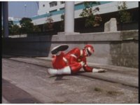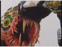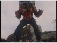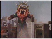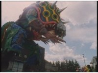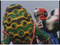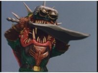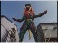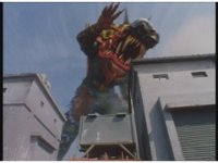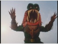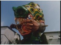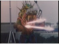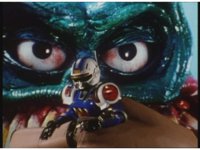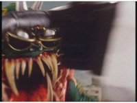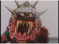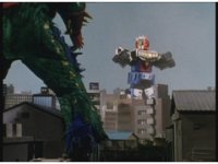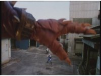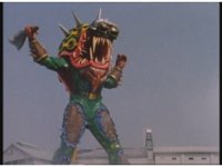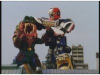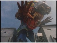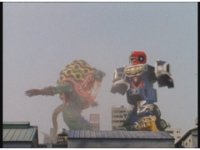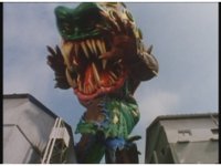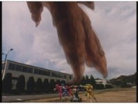 Terrortooth is giant again, and armored again, as he marches in, looms over the five Rangers, who fire Turbo RAM at him, which barely phases him. They scramble about, then he reaches down for them, but they slip away. |