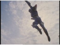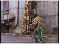 While held before Terrortooth's face, Blue Senturion struggles in his hand, waving arms, before turning around to us. |