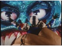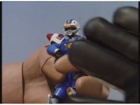 While held before Terrortooth's face, Blue Senturion turns around in his hand, talking downward while holding something in his left hand (shh!) |