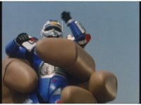 Red rises up, rushes at Blue Senturion, slaps his chest as they grasp each other and struggle, Red talking to him until he releases him roughly. |