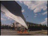 Mirrored-windowed skyscraper erupts outward from within, spraying debris onto the many surrounding buildings. |
