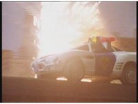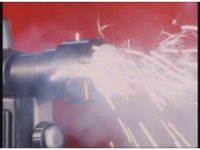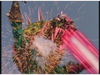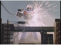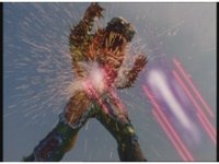 Trims start to remove visibility of wrist blade; cuts follow-up of Robo Racer firing blast from chest headlights at monster. |