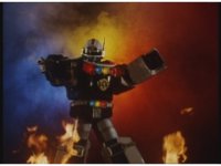 A quick close-up of Robo Racer's face, before an upward shot of it posing battle ready over us. |