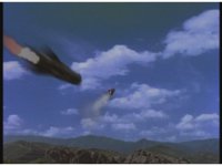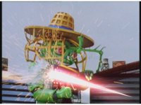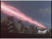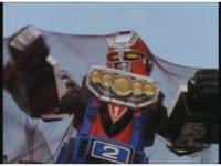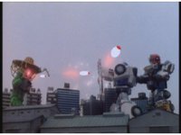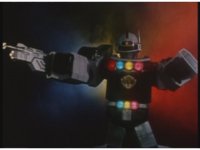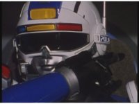 In Robo Racer cockpit, Blue Senturion reaches down and shifts gear, causing chest headlights to light up. Robo Racer pulls out a wrist blaster on its right arm, which it points forth and fires repeated bursts of energy. |