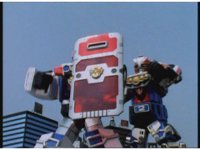 Blue Senturion talks and shifts gear, causing his Zord to shift around, transforming out of patrol car mode. Upon exiting the tunnel, Robo Racer finishes transforming into robotic Zord mode in a flash of blue energy, saluting before his giant badge symbol. |