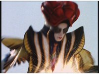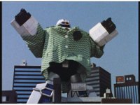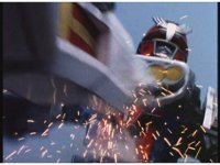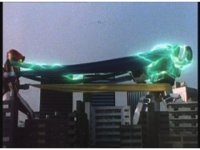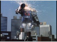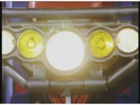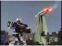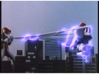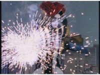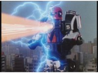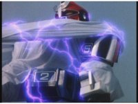 A button is pressed, the Turbo Megazord chest headlights come on, a quick motioning of the arms and the headlights fire a reddish beam with blue electricity forth |