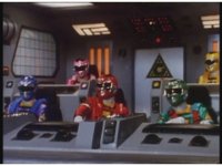 In the Megazord cockpit, all five Rangers lift their Turbo Keys, then raise them, before Red inserts his on the console, and turning. |