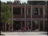 Distant exterior front entry gateway path of Angel Grove High School, a pack of students seemingly leaving. |
