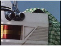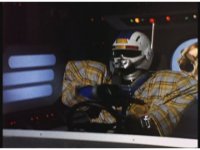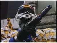 In Robo Racer cockpit, Blue Senturion motions and gestures left hand, zoom in as he reaches down and shifts gear, causing chest headlights to light up. Robo Racer pulls out a wrist blaster on its right arm, which it points forth and fires repeated bursts of energy. |