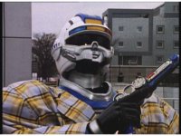 The jacketed Blue Senturion finds himself surrounded by Rangers. |