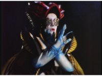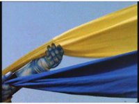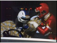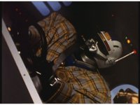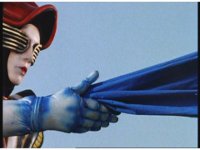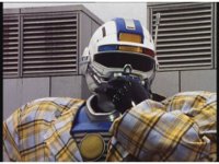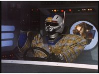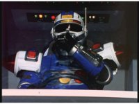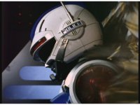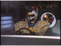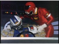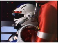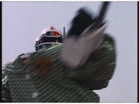 Zoom out from jacketed Blue Senturion in cockpit, as Red tries to take off the coat, only to get gut punched away. |